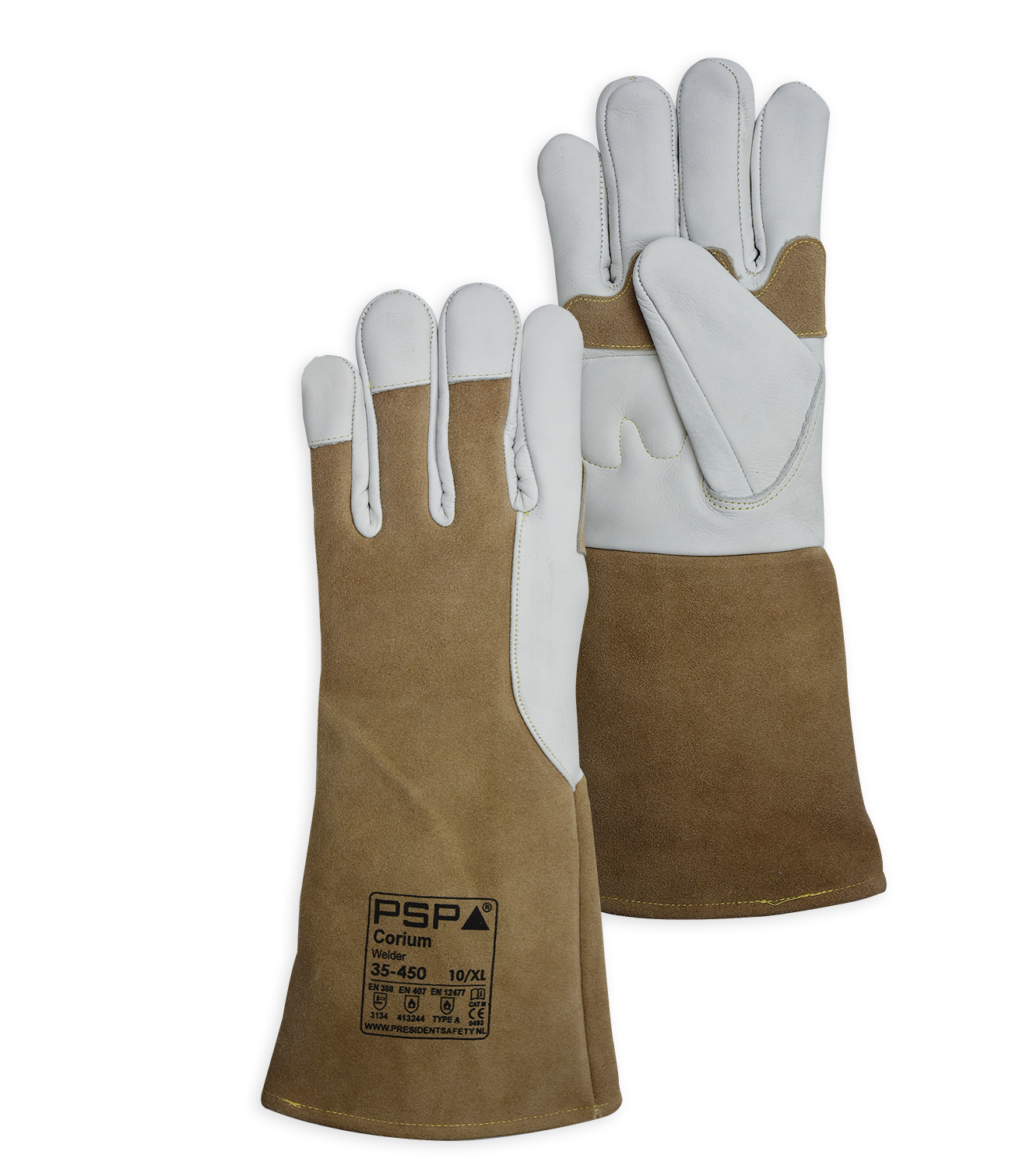 35-450 Leren Lashandschoen / Eigenschappen / Welder / 5 vingermodel / Goede pasvorm / Nerflederen palm met splitlederen palmversterking / Schokabsorberende palm / Extra dikke molton voering / Totale lengte 40 cm / Kevlar naden / Vrij van Chromium VI en PCP / Keuringen conform:EN420 / EN388:2016 / EN407 / EN12477 Type A