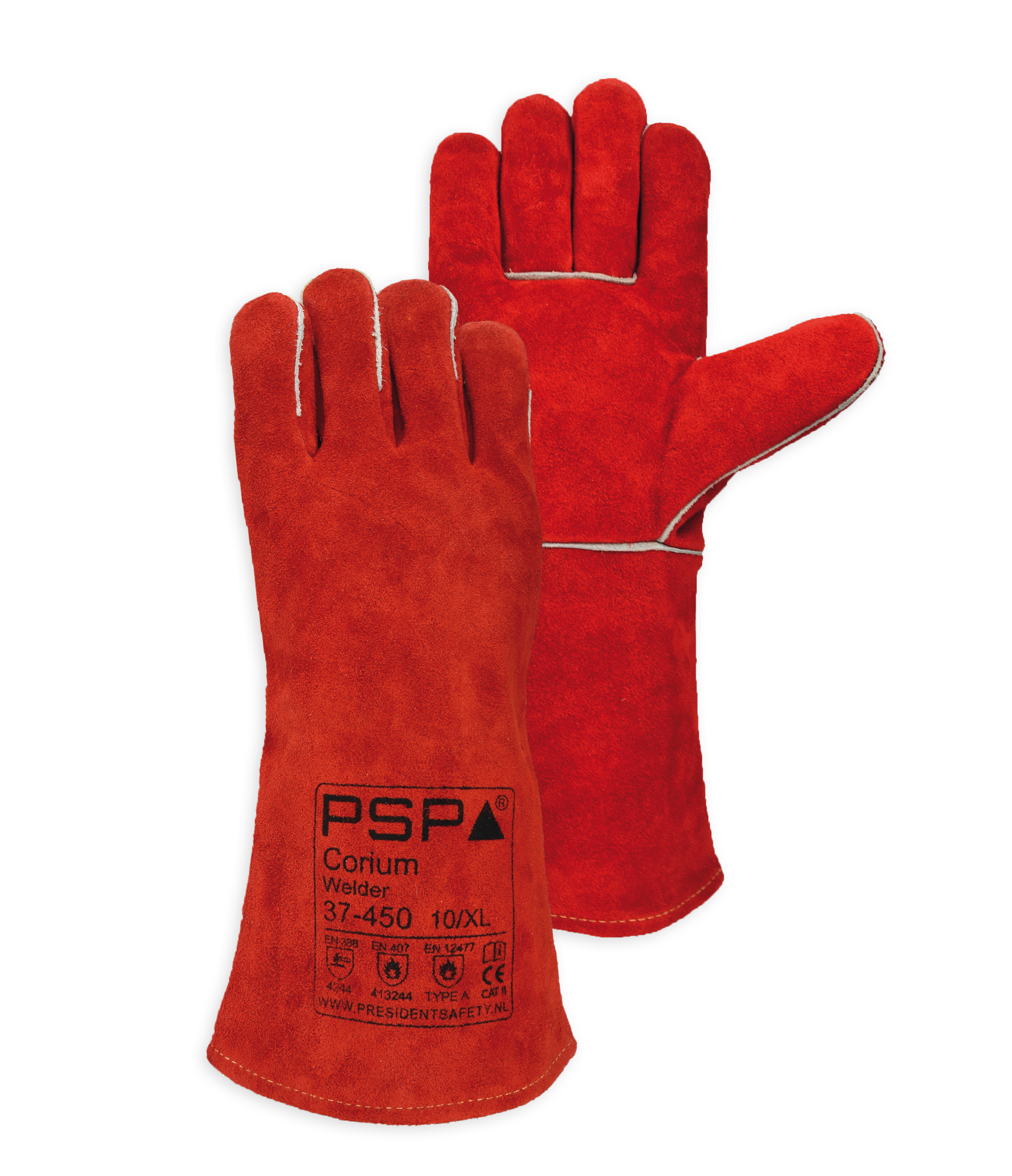 37-450 Leren Lashandschoen / Eigenschappen / Welder / Rundsplitleder 35 cm / Lengte 35 cm / Kevlar gestikte naden / Paspoil versterking / Zware molton voering / Chromium VI vrij / Snijklasse 2 / Keuringen conform: EN420 /EN388:2016 / EN407 EN12477 Type A / Koudebestendig / Hittebestendig